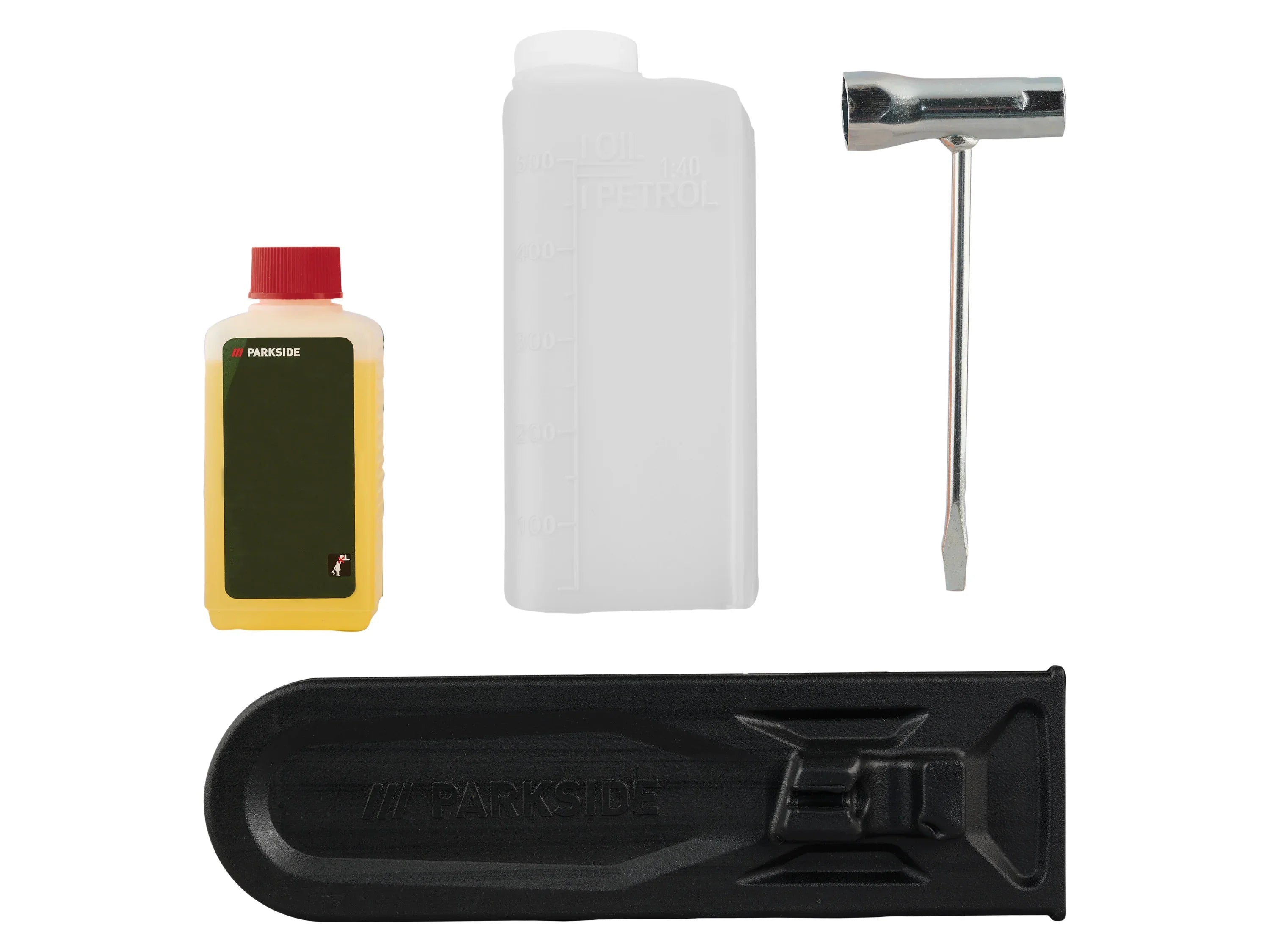 Fornito con protezione per la catena, utensile combinato, tanica per miscela di carburante (500 ml) e 180 ml di olio biologico per catena "Made in Germany".